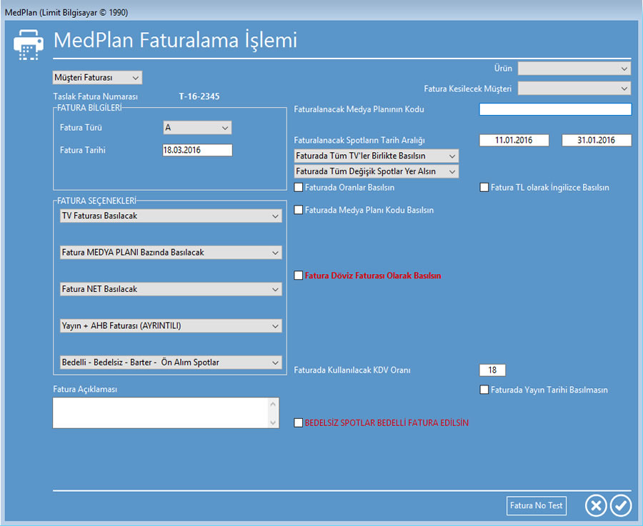 Fatura ekranı - Medya sektöründe kullanılan tüm fatura türlerinde fatura kesilebilir.