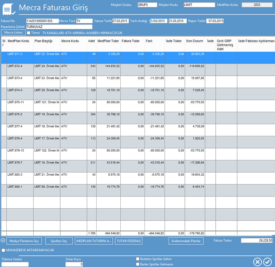 Mecra Fatura ekranı - Mecra'dan gelen faturalar planlar ile karşılaştırılır.
