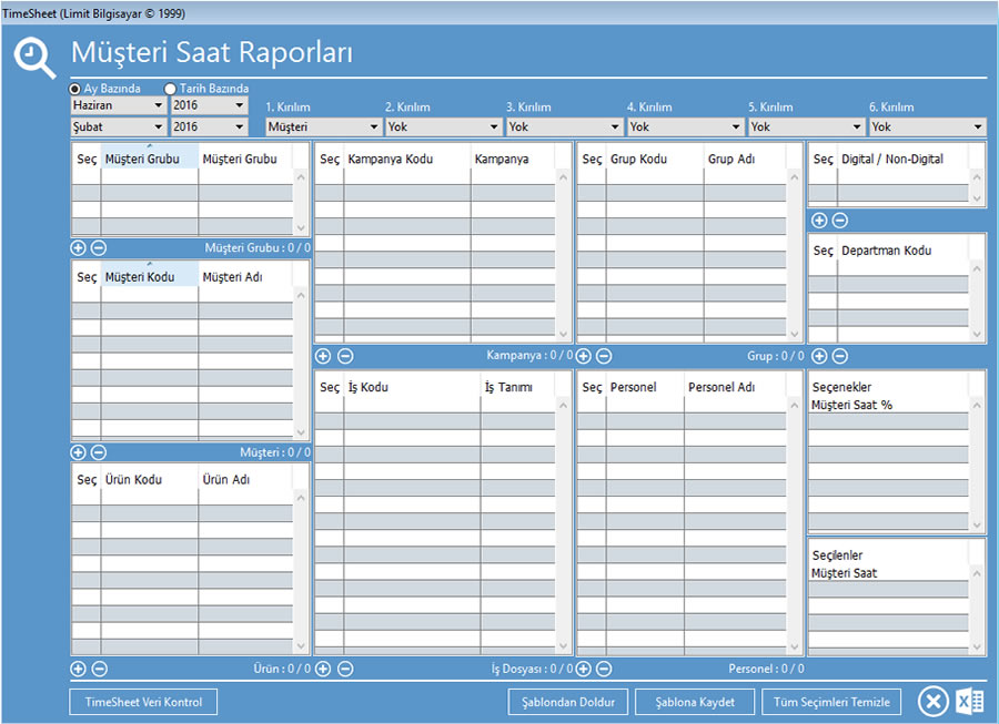Müşteri Saat Raporları - Çeşitli filtreler kullanılarak raporlar oluşturulur.